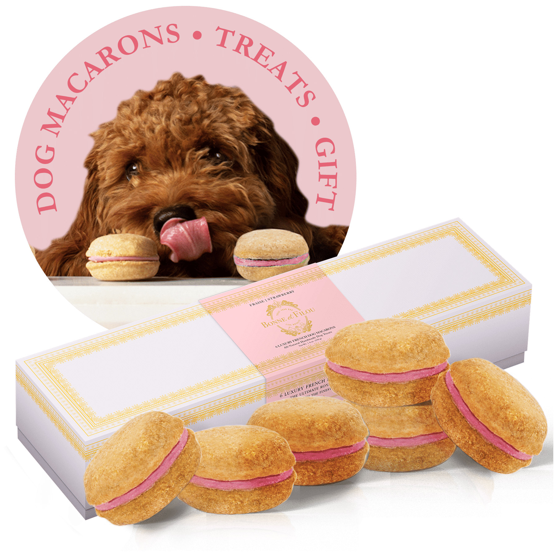 Dog Macarons - Count of 6 (Dog Treats | Dog Gifts)This box of our premium macaron treats features: - Box of 6 dog macarons- Handmade with premium human-grade ingredients in the USA- 100% natural; corn-free; wheat-free ingredients- No artificial coloring or preservatives- Hard treat designed for a long-lasting chew- Shelf life of 12+ months | No need for refrigerationBase Recipe Ingredients: Oat Flour; Honey; Coconut Oil; All-Natural Flavored Yogurt FillingFeeding Instructions:Our treats are hard; designed for a long-lasting chew. For elderly or small dogs; we recommend breaking the treat in smaller pieces (by twisting both sides).