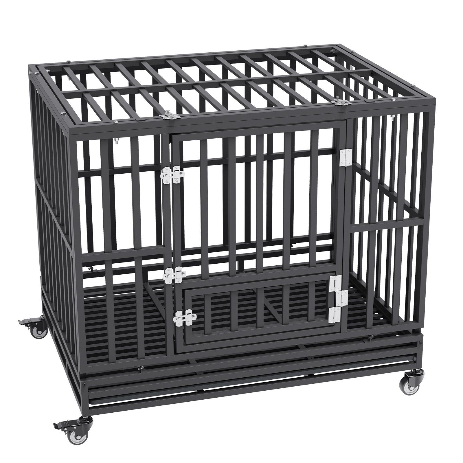 Our 42.1"×30.3"×37" heavy duty dog crate provides spacious space for medium to large dogs. It allows your pet to move, turn, stand, and lie down freely. The top door enables close interaction, while the front door allows easy access. You can provide food and water through the feeding door.